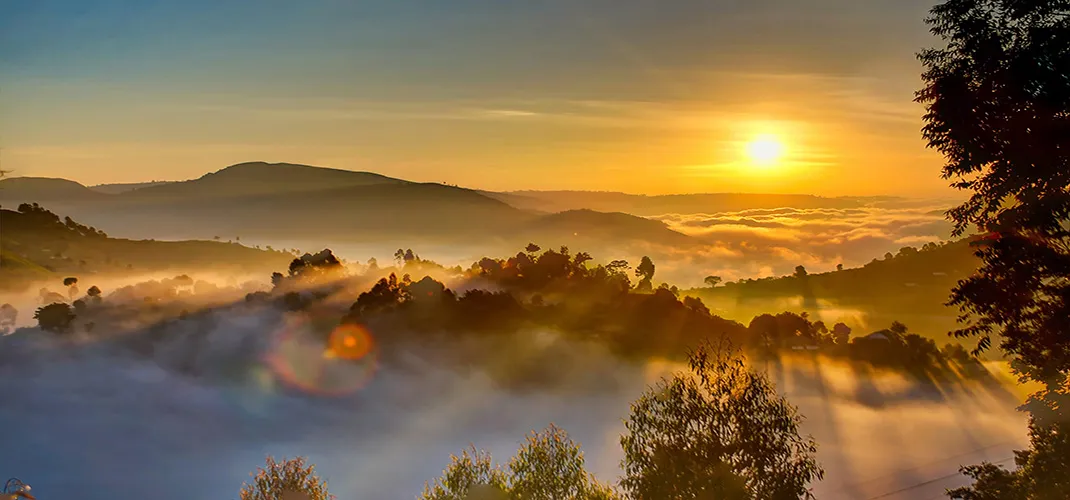 Sunrise Over a Misty Hill Landscape, Uganda